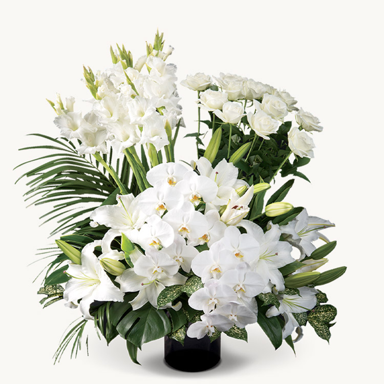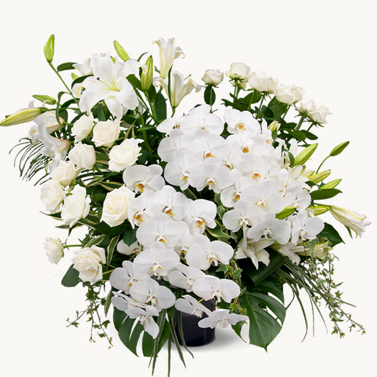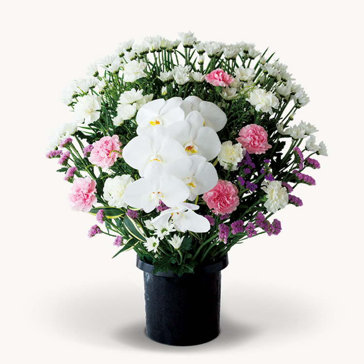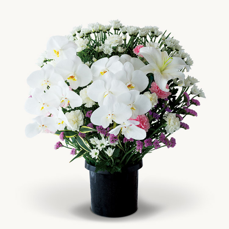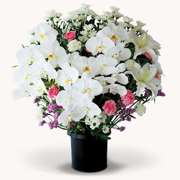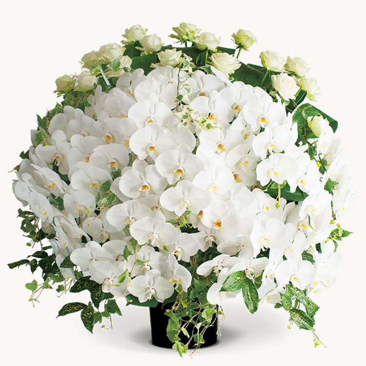 26,400円から胡蝶蘭が2本入りますので、生花祭壇のように式場で映えることもあり、よくお選びいただいています。また、喪主様や故人様との関係が深い方は66,000円を選びになる方もいらっしゃいます。